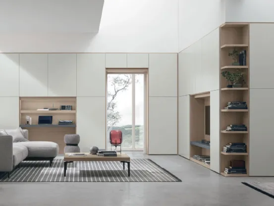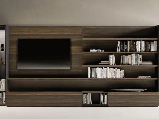 In soggiorno le pareti attrezzate sono sistemi di arredo versatili e intelligenti, che grazie alla loro componibilità si adattano allo spazio disponibile. Servono a ordinare e contenere libri, oggetti, la tecnologia dedicata all’intrattenimento. L'ampia gamma di materiali e finiture permette di personalizzarle e abbinarle agli altri pezzi dell'arredo.