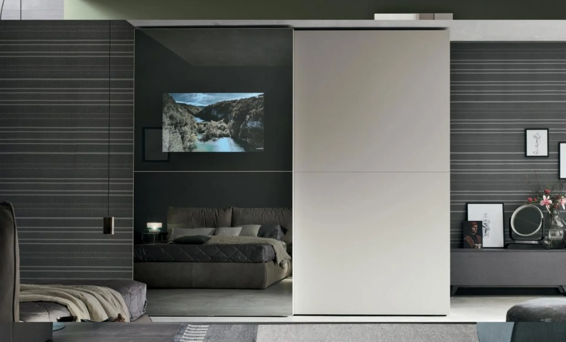 Per allestire alla perfezione una stanza bella e di grande qualità, scegli le più belle soluzioni dei migliori produttori, letti, armadi e comodini di grande design. Gli Armadi a muro con ante scorrevoli sono elementi essenziali in camera, per renderla arredata con gusto, pratica e completa di tutto. Contattaci e scopri di più sulla nostra serie di Arredamento Casa: potrai ultimare la zona del riposo usufruendo di una ampia gamma di contenitori design, come l'armadio in vetro nella fotografia. Armadio anta scorrevole Vision con Tv integrata di Tomasella: compila il form per ricevere informazioni di ogni genere e consigli per allestire la camera che hai sempre voluto.