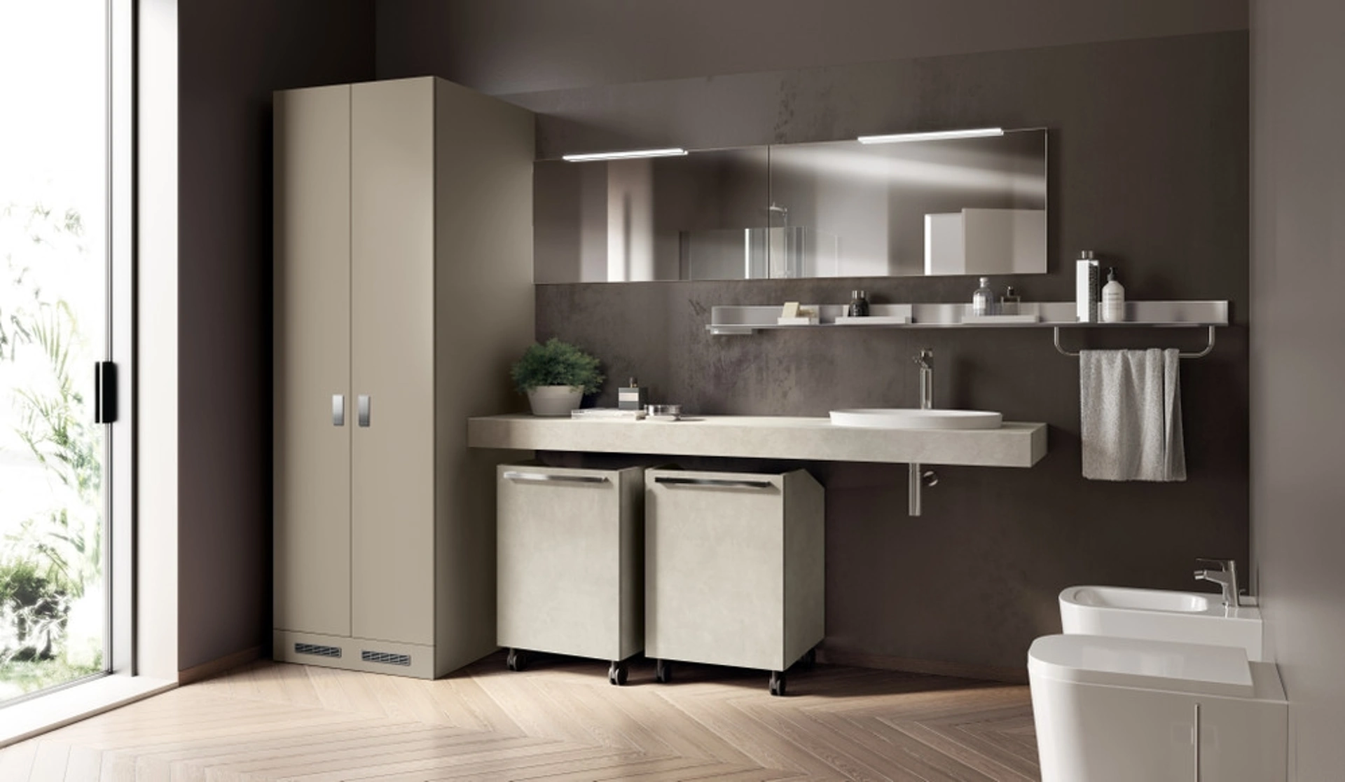Arreda la stanza del benessere moderno alla perfezione con Laundry Space Aquo Visone, mobili bagno per lavanderia e oggetti in laccato opaco di Scavolini Bathrooms.