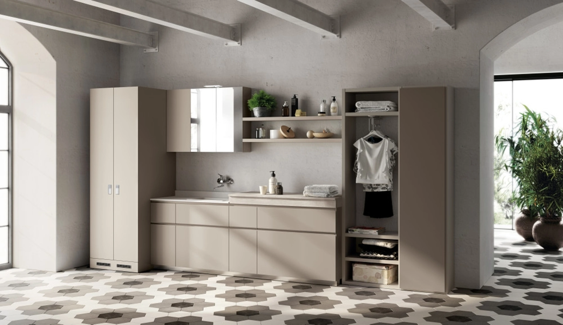 Arreda la stanza del benessere moderno al meglio con Laundry Space Rivo Juta, mobili bagno per lavanderia e accessori in melaminico di Scavolini Bathrooms.