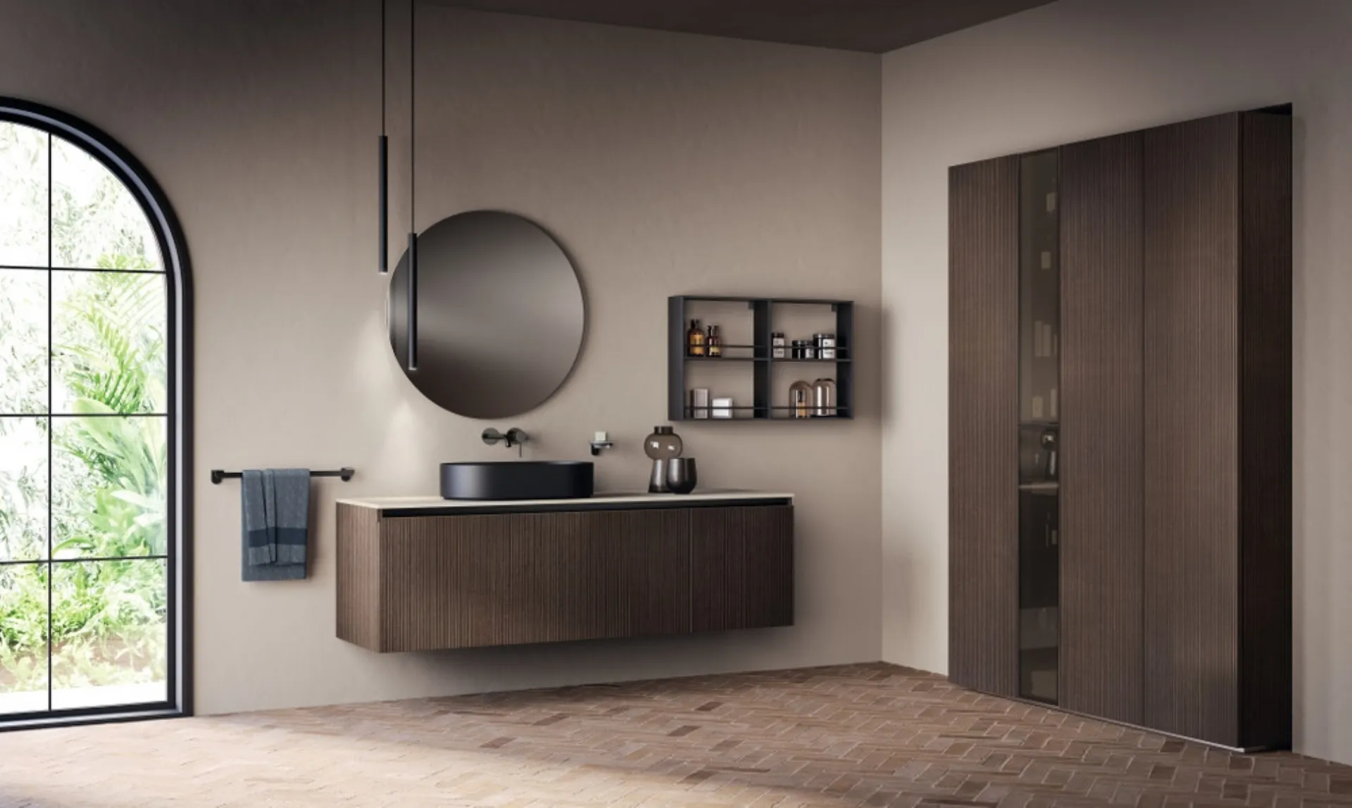 Arreda la stanza del benessere moderno perfettamente con Miko Decorativo Lodge, mobili bagno sospesi e accessori in melaminico di Scavolini Bathrooms.