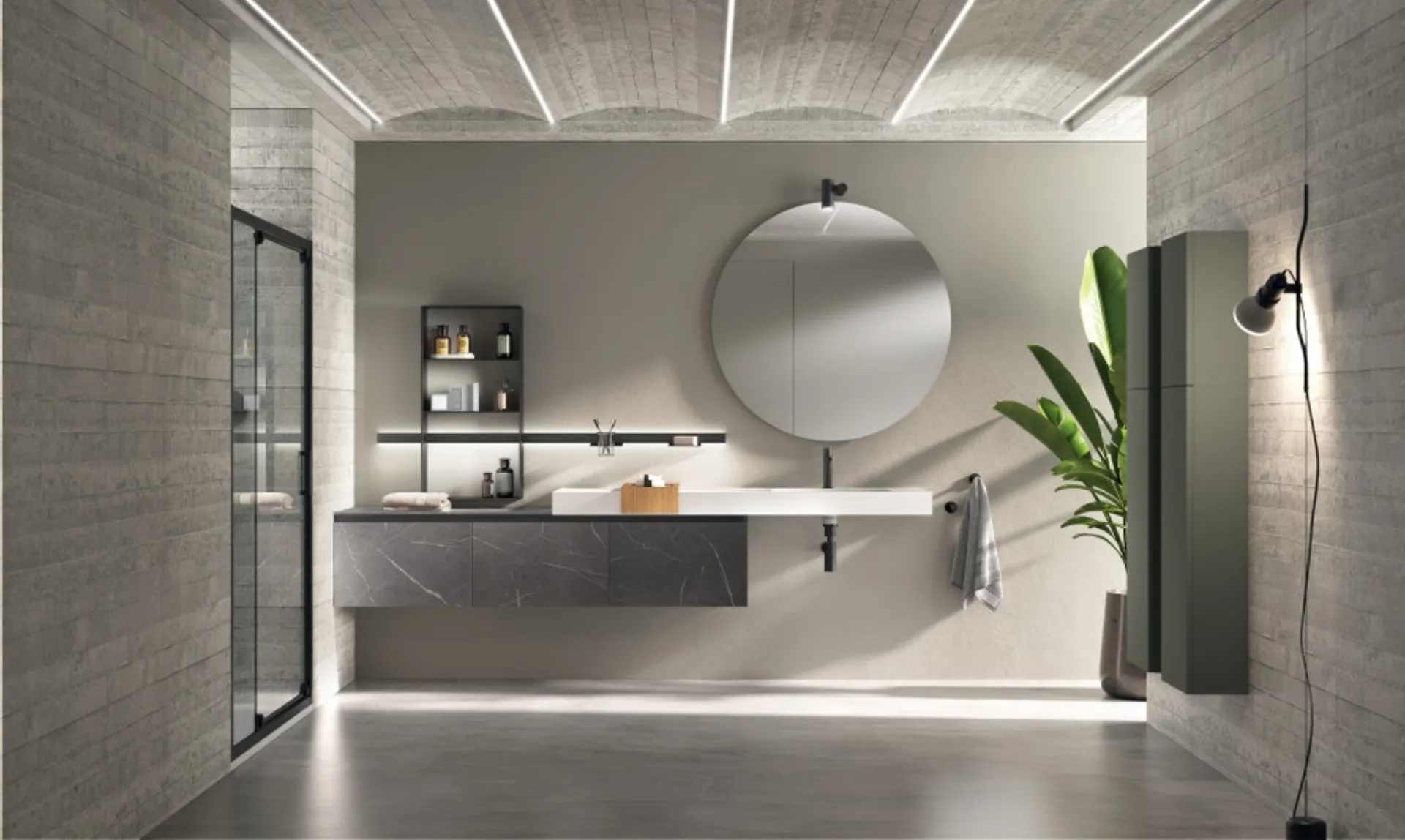 Scopri di più sull'arredo bagno moderno: mobili bagno sospesi in laminato come il modello Miko Laminato Pietra Grey di Scavolini Bathrooms ti aspettano.