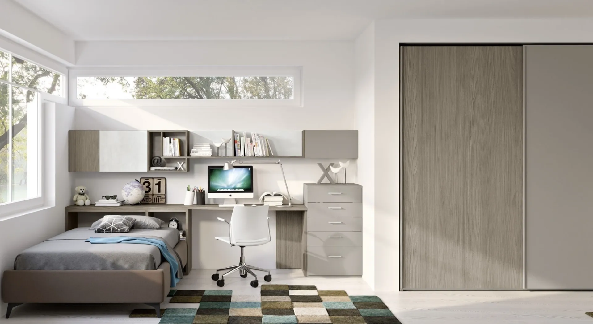 Arreda stanzette moderne con le Camerette su misura Ferrimobili! Il modello Cameretta moodbook 205 in laccato opaco è per ragazzi.