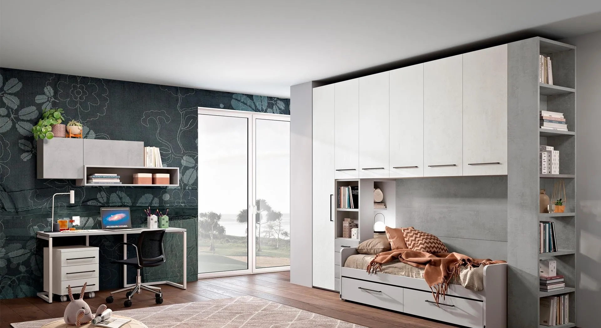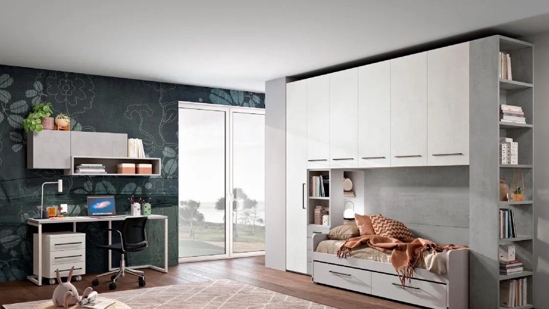 Arreda stanzette moderne con le Camerette a ponte Ferrimobili! Il modello Cameretta moodbook 214 in laccato opaco è per ragazzi.