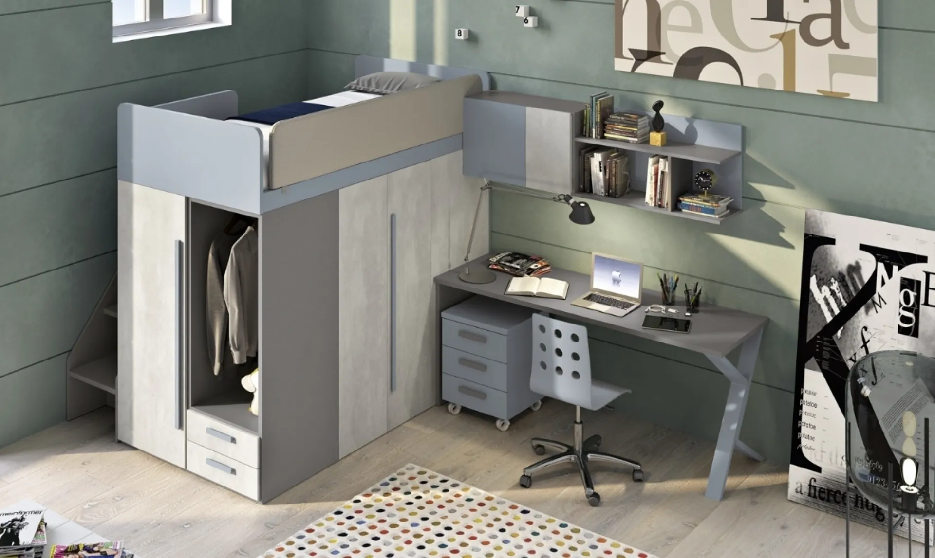 Clicca e ottieni informazioni sulla cameretta per ragazzi Cameretta moodbook 218! Le Camerette a soppalco Ferrimobili ti aspettano.