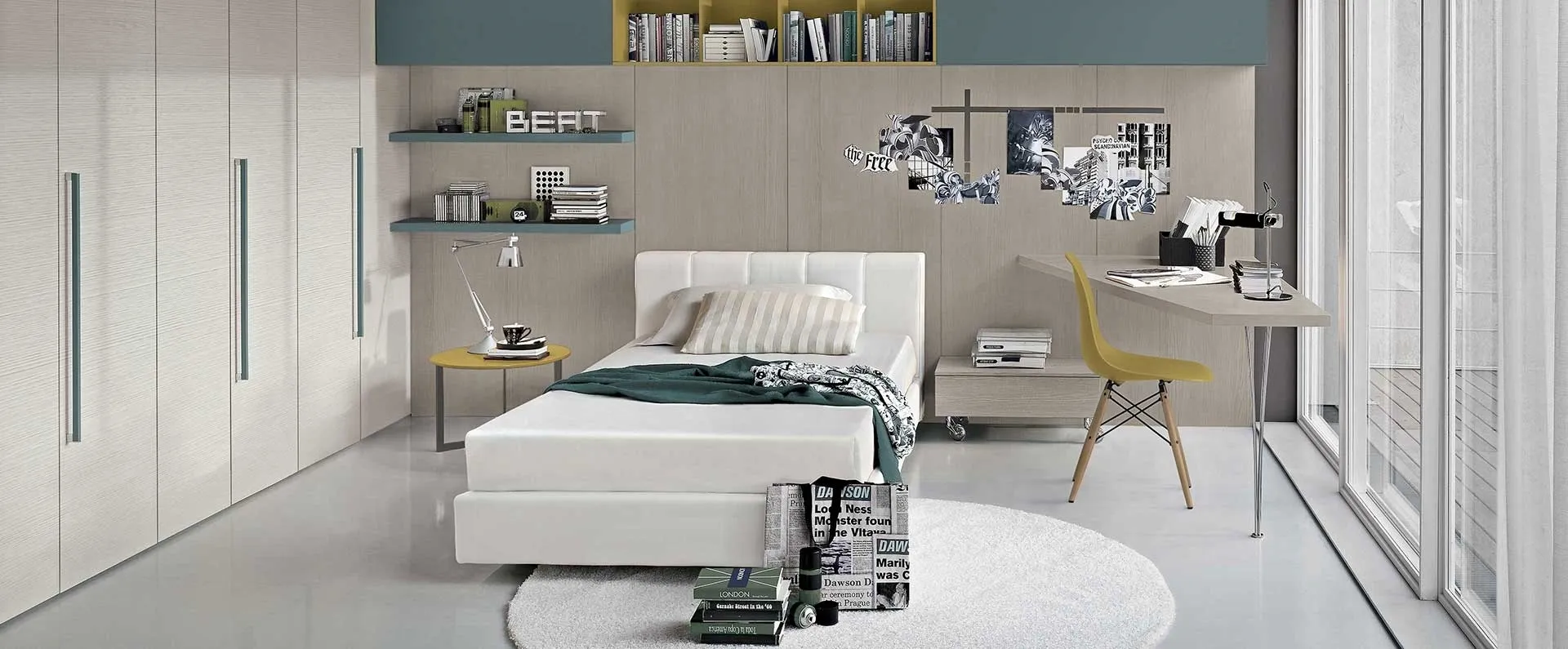 Arreda stanzette moderne con le Camerette componibili Tomasella! Il modello Composizione 02A in melaminico è per ragazzi.