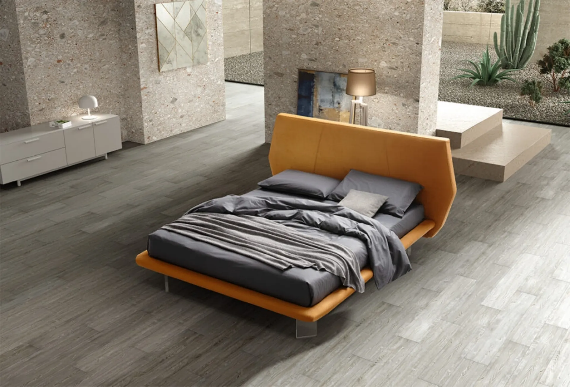 Se vuoi letti matrimoniali imbottiti, eccoti il modello Giulia in tessuto per completare la zona notte.