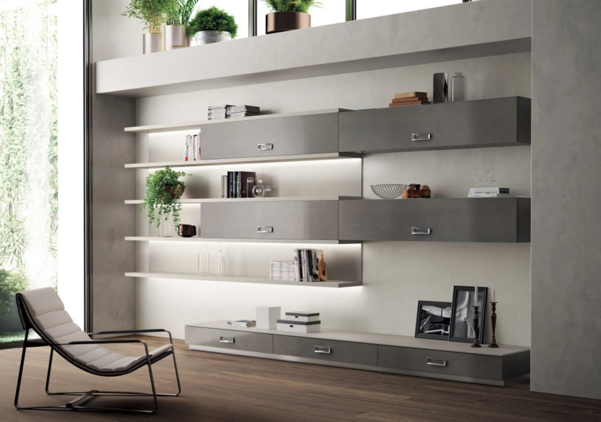 Clicca e scopri le Librerie componibili moderne! Il modello Living Exclusiva Stained Steel Scavolini saprà completare un soggiorno pratico e dinamico.