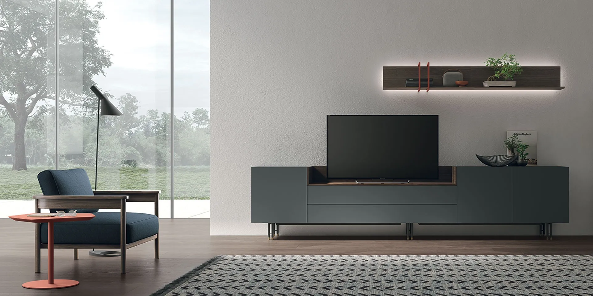 Mobile porta tv per il living Tomasella in melaminico: clicca e ottieni informazioni sul modello Atlante Unit AT 140, pensato per spazi moderni.