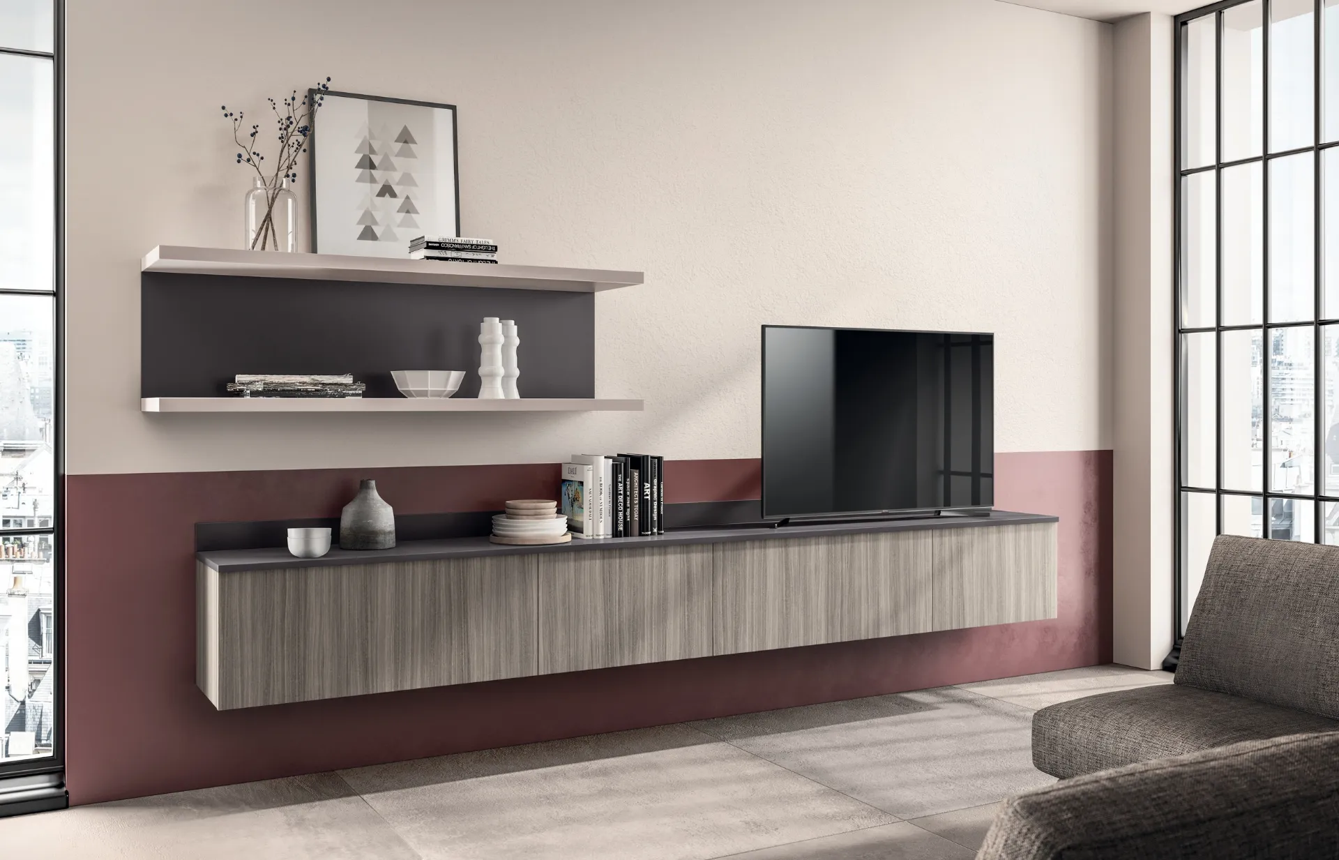 Attraverso un gioco dinamico di accostamenti fra elementi a giorno o vani chiusi, le Pareti Attrezzate moderne arredano il soggiorno sfruttando bene ogni spazio. Le Pareti Attrezzate hanno conquistato un posto di primo piano nella zona giorno delle nostre case: sono arredi multifunzionali e salvaspazio sempre realizzabili su misura. Per informazioni e preventivi sulla Parete Attrezzata sospesa Living Easy Urban in decorativo Eucalipto Taj di Scavolini nell'immagine contattaci! Il modello proposto è realizzato in melaminico, ma grazie ad una vasta gamma di finiture, cromie e forme, potrà adattarsi a stili di ogni genere. Questa parete attrezzata è una delle soluzioni della firma e ti consentirà di allestire il soggiorno secondo le più personali esigenze abitative.