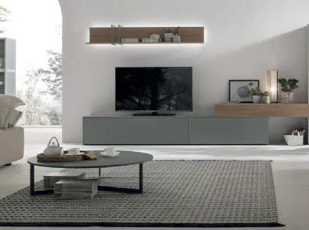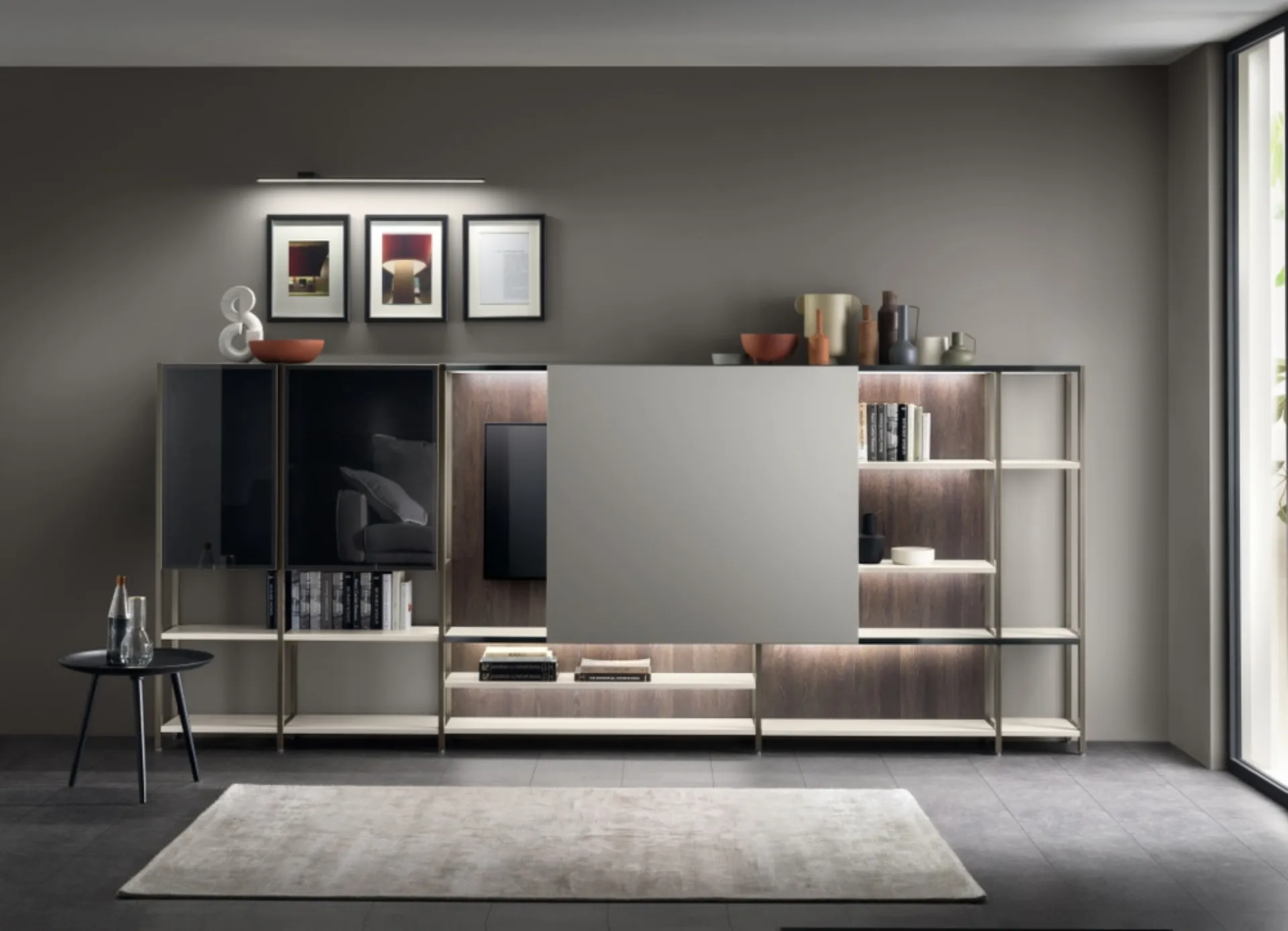 Vuoi ammobiliare un living operativo e pratico? Ecco a te la parete attrezzata Living Formalia con Anta scorrevole in Pet Pioggia Scavolini dalle forme decise moderne.