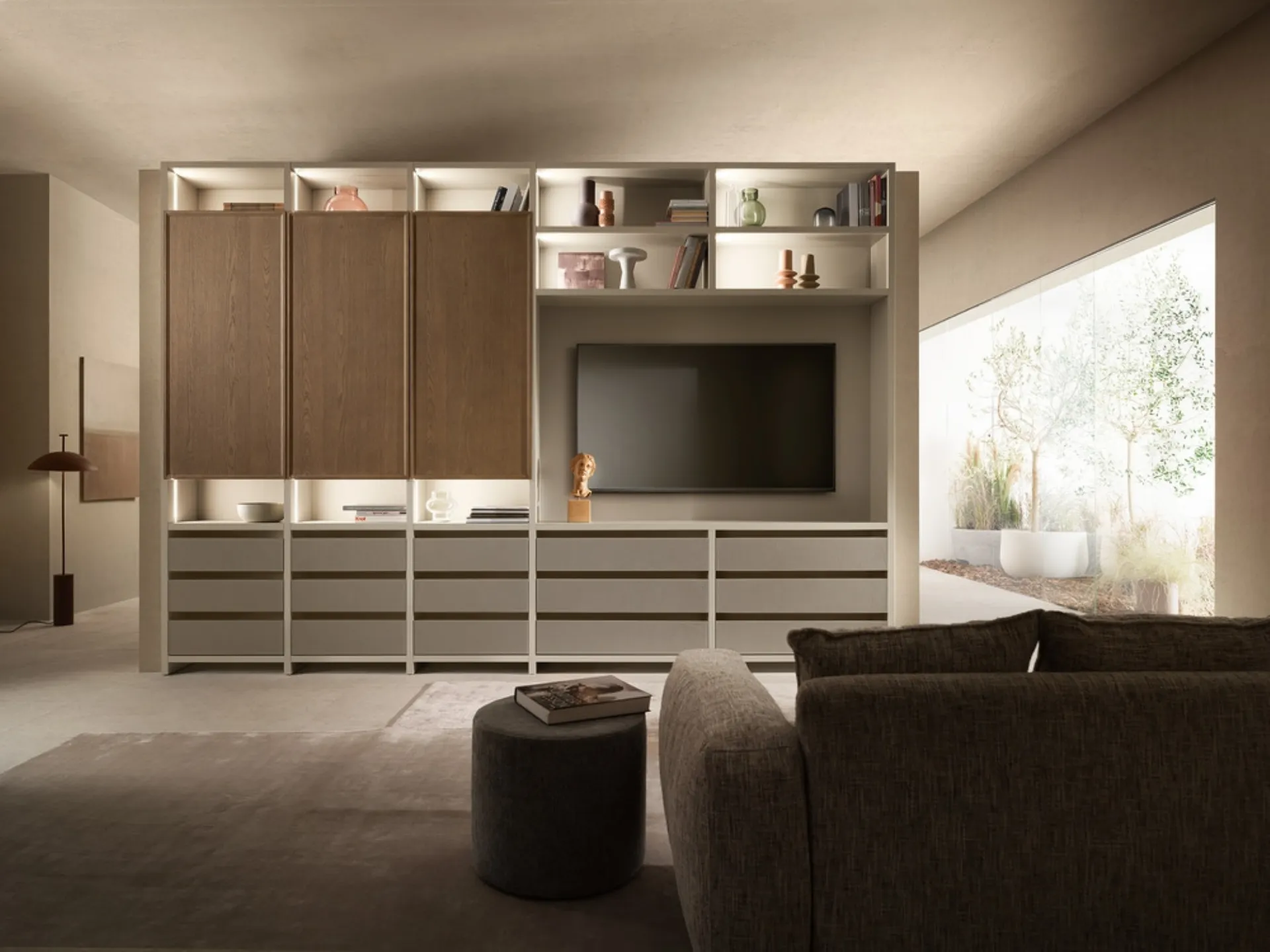 Clicca e scopri di più sulla parete attrezzata Living Poetica 01 del brand Scavolini: è la soluzione dalle linee moderne perfetta per te.