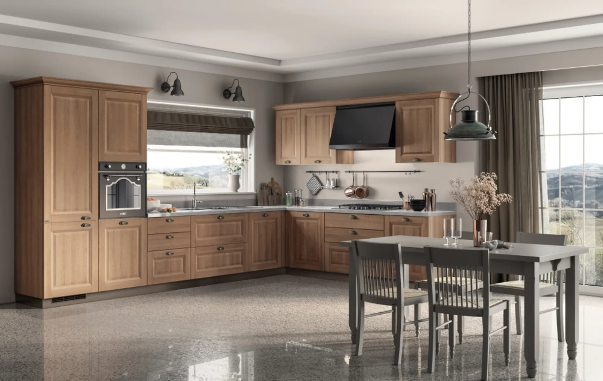 Scegli la cucina Family decorativo Rovere Azteco angolare: le soluzioni classiche Scavolini in melaminico sono garanzia di qualità, stile e design.