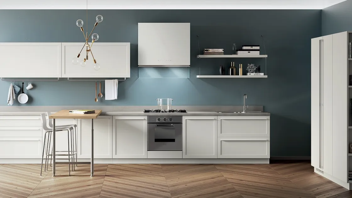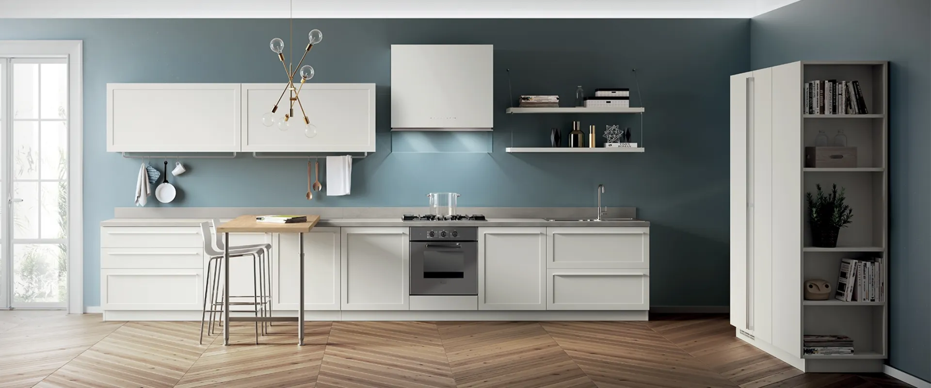 Se desideri una cucina moderna Scavolini, Carattere Bianco Prestige con penisola in laccato opaco ti attende nel nostro negozio di Cucine Moderne con penisola.