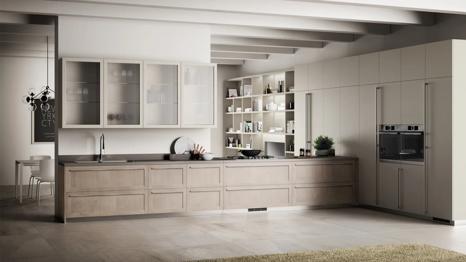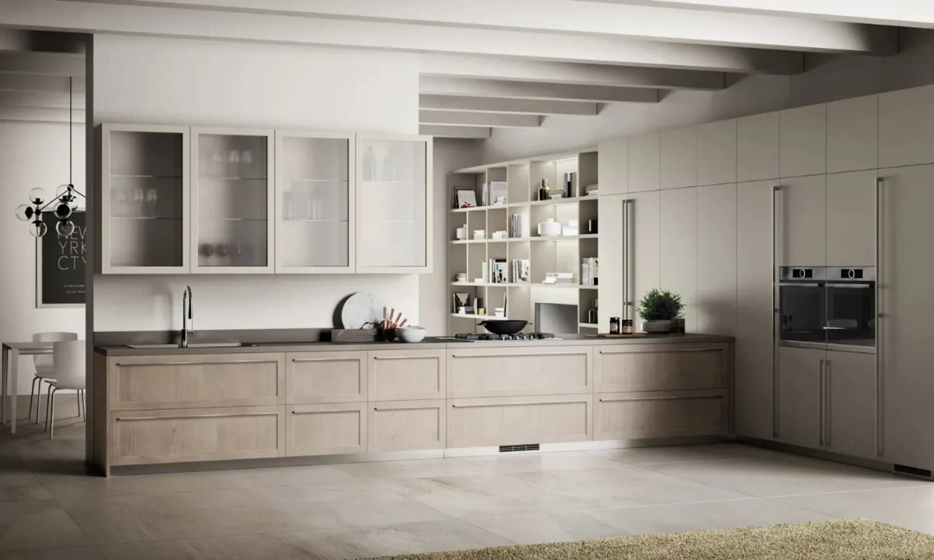 Scopri di più sulla cucina Carattere in Frassino Arena e laccato Tortora di Scavolini: questa soluzione in legno sarà l'acquisto ideale per te!