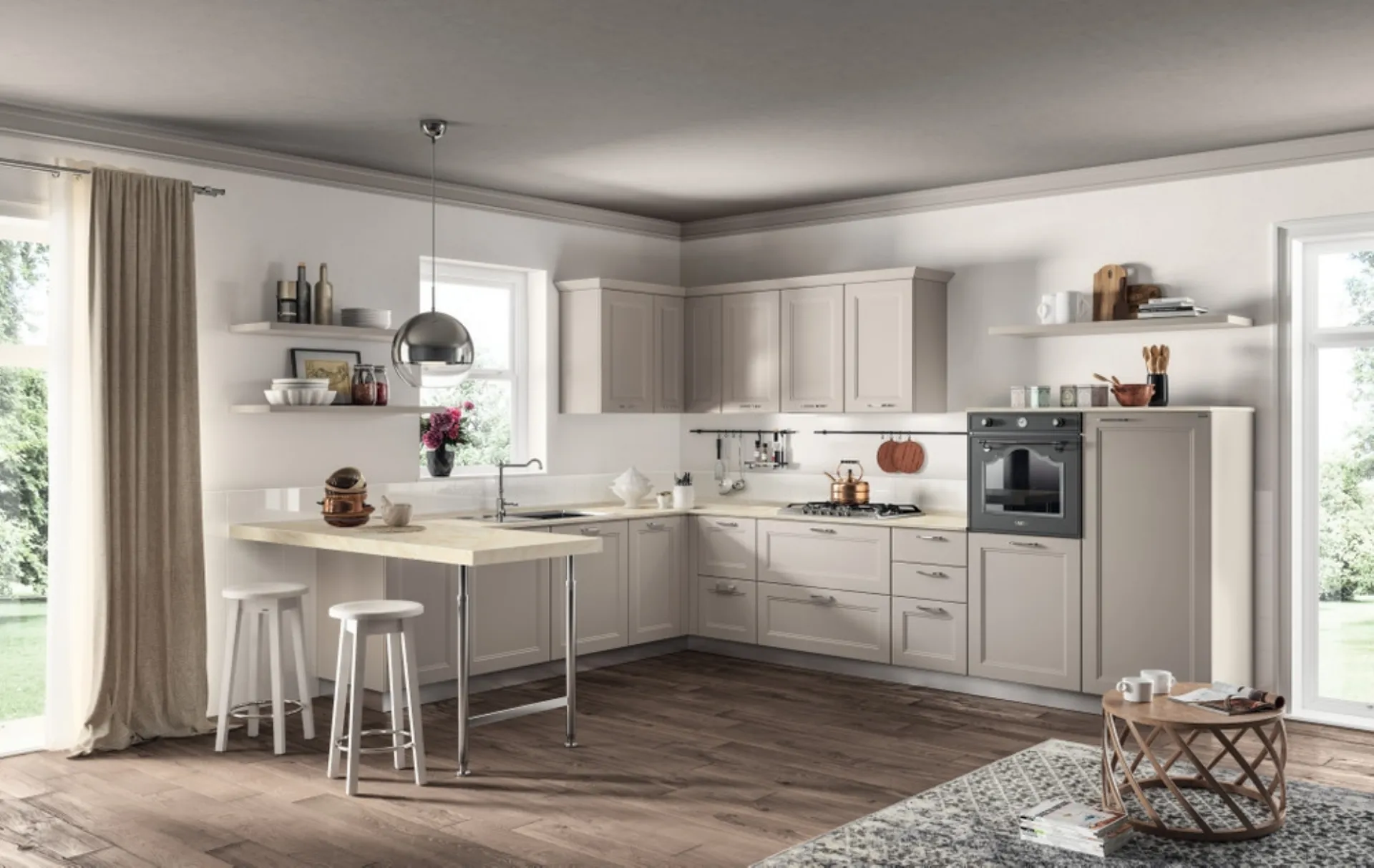 Cucine Moderne ad angolo: clicca e scopri una ricca gamma di soluzioni del marchio Scavolini, tra cui il modello Colony laccato opaco Sabbia.