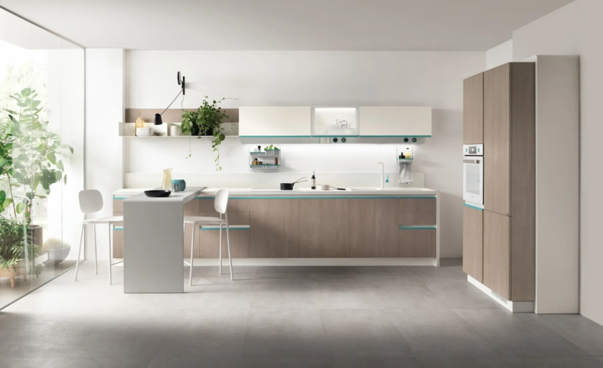 Se vuoi una cucina moderna Scavolini, Dandy Plus Rovere Gessato e maniglia Blu Agave in melaminico ti sta aspettando nel nostro negozio di Cucine Moderne con penisola.