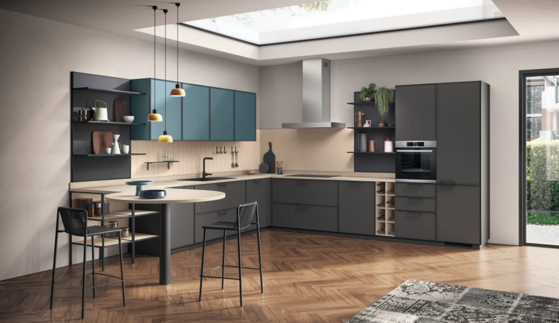 Clicca e scopri un mondo di Cucine Moderne con penisola: la cucina Jeometrica 02 Grigio Ferro e Verde Ottanio Scavolini in laccato opaco ti attende!