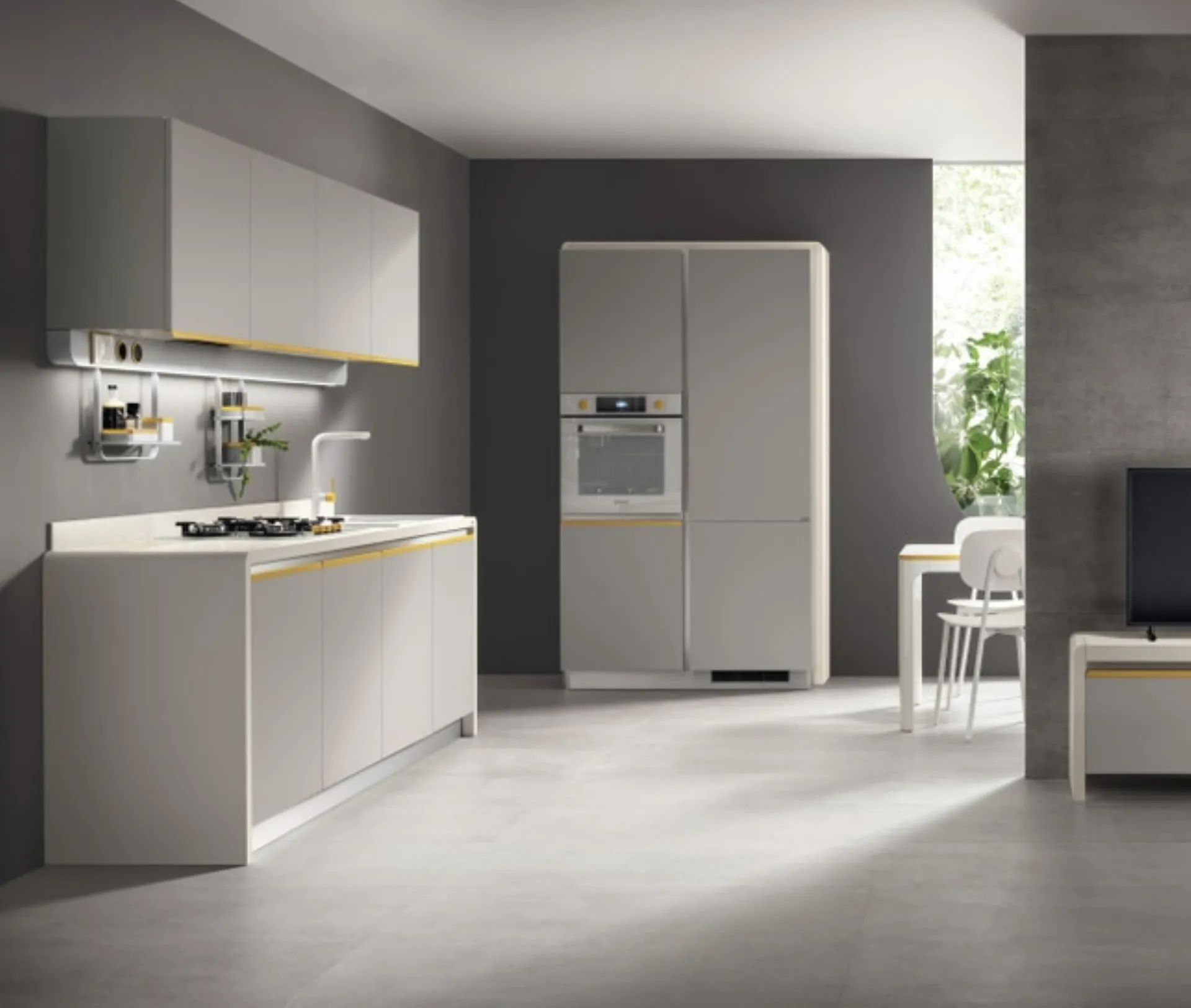 Se cerchi una cucina moderna, scopri di più sul modello Dandy Plus Grigio Velo e maniglia Giallo Senape Scavolini.
