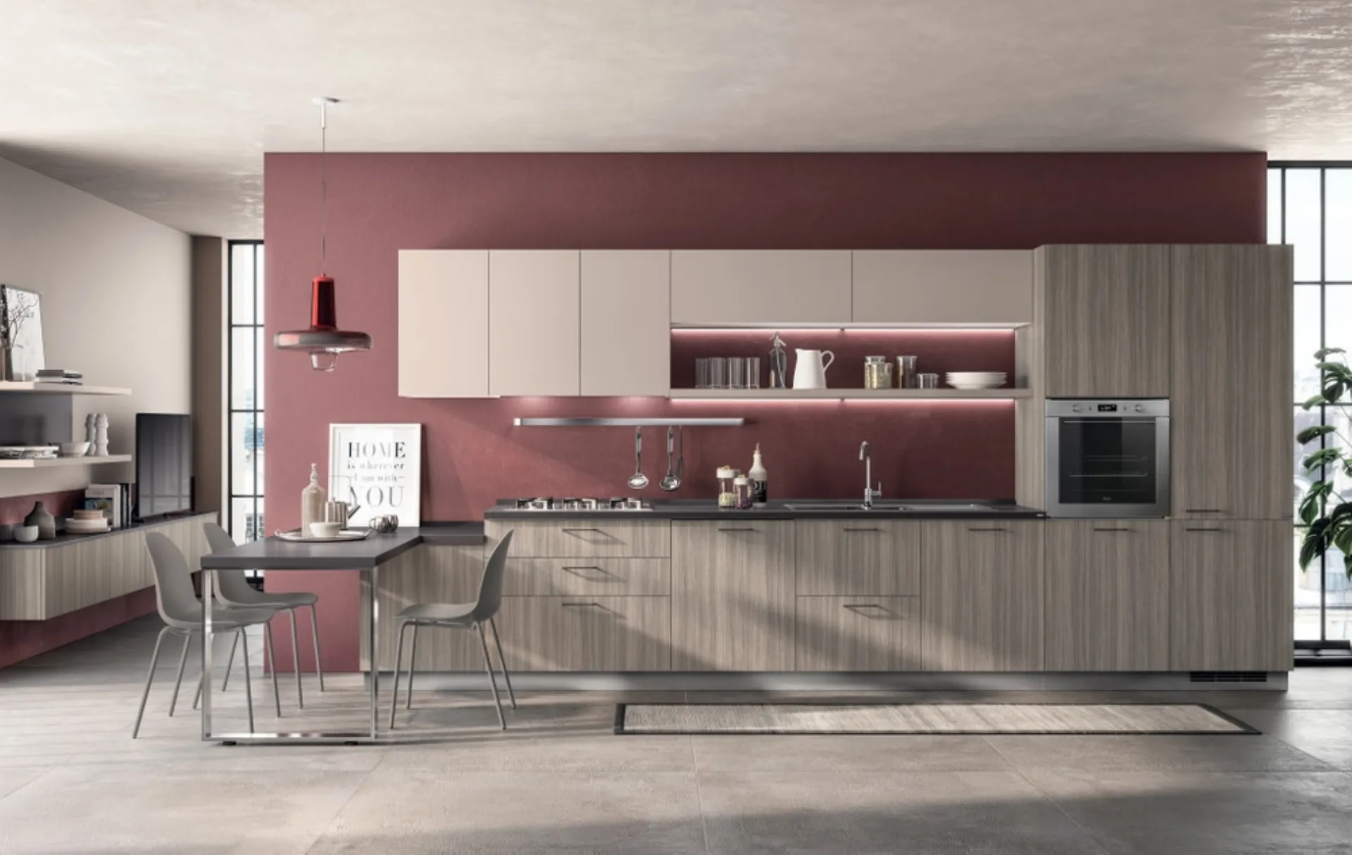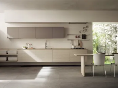 Clicca e scopri un universo di Cucine Moderne con penisola: la cucina Urban & Urban Eucalipto Taj e Sabbia Easy Scavolini in melaminico ti sta aspettando!