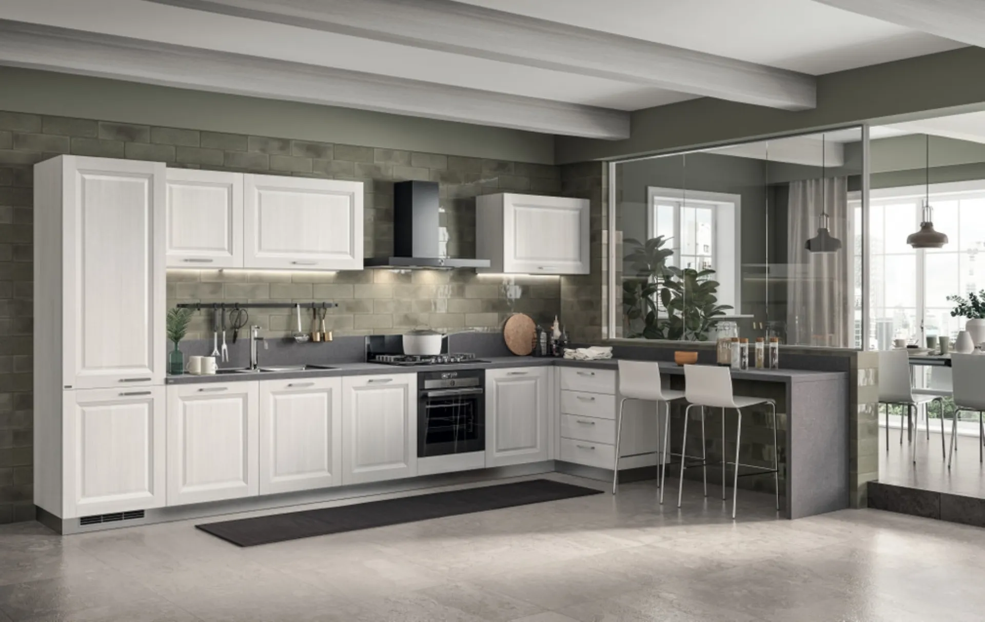 Cucine su misura Scavolini: opta per il modello Family decorativo Larice Neve in melaminico tra le nostre soluzioni ad angolo!